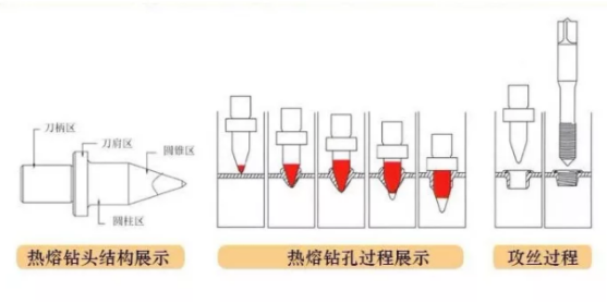 上圖很好的展示了熱熔鉆孔攻絲的整個加工過程,通過特殊處理過的熱熔鉆頭,在高速旋轉(zhuǎn)接觸到金屬材料表面的瞬間,會產(chǎn)生600℃-800℃的高溫,高溫軟化金屬的同時,高速主軸帶動熱熔鉆頭快速旋轉(zhuǎn)下壓,被擠壓的那部分金屬沿著圓孔朝上下延伸,形成比原金屬厚度三倍左右的厚壁層。熱熔鉆孔的整個加工過程不會破壞金屬材料的結(jié)構(gòu)和性能,同時形成的厚壁層具有抗扭力/拉力的性能,可以直接進行高質(zhì)量的無屑攻絲。